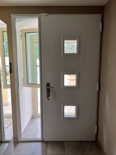 La porte Frostyl + SL est la solution dédiée aux grandes largeurs, elle contient un simple vantail en plus d'une partie fixe latérale. Le bloc-porte peut être vitré avec un vitrage blindé, lui aussi ou non vitré, cela n'empêchera pas une bonne isolation thermique tout comme la performance de l'isolation contre l'air, l'eau et le vent.